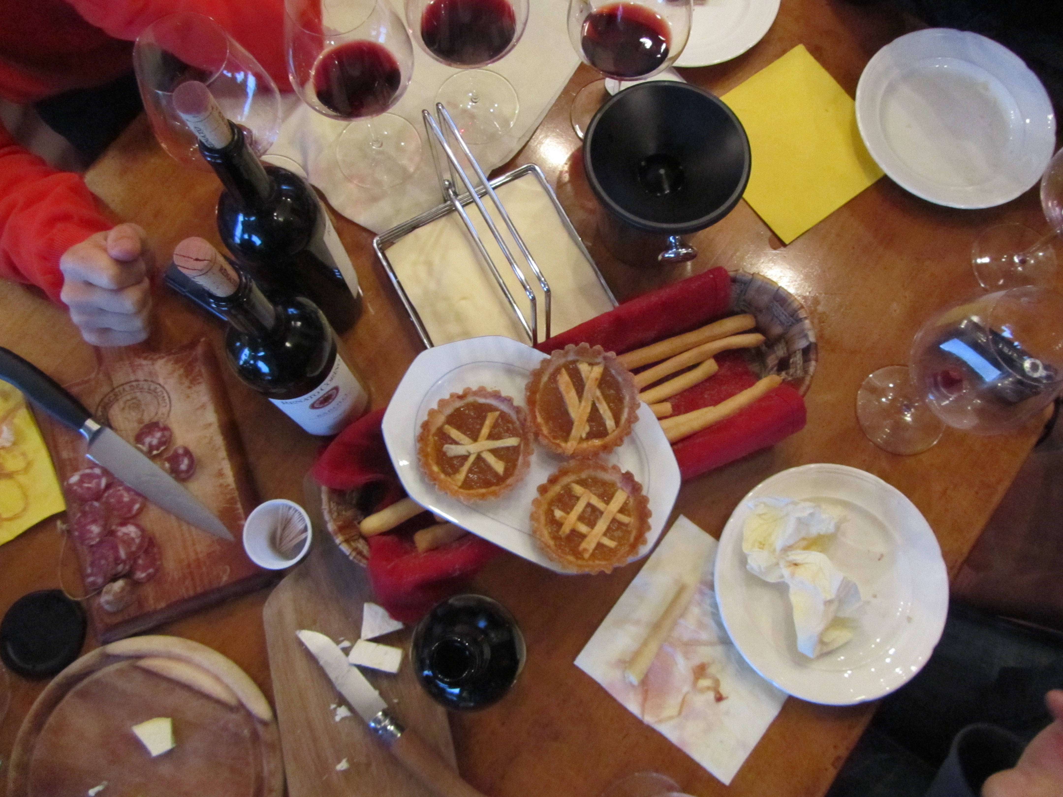 Fortunately the day was warm enough that we could sit out on the terrace, which I have to say, is certainly one of the best places to drink Barolo while in Barolo, if not the best. We tasted through all the current releases – me for the second time. My opinions of the wines hadn’t changed. If anything, they improved, but that tends to happen in the company of good friends and food. (I reviewed these in my first Renato Corino entry.) Alongside the wines, Renato and Lili served up an endless supply of Tome (my favorite Piemontese cheese), salumi, and grissini and Lili brought out homemade pies at the end.