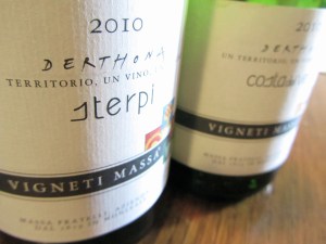 Massa Costa del Vento 2010. Timorasso 100%. The vines of Costa del Vento were planted in 1990 and 2004. On the nose this one displays a rich warm bouquet: herbs and peaches. Rich and fruity in the mouth with a spicy finish — spicier, richer, and more fruity than Sterpi. It’s a western exposed slope with clay and limestone soil. ★★☆